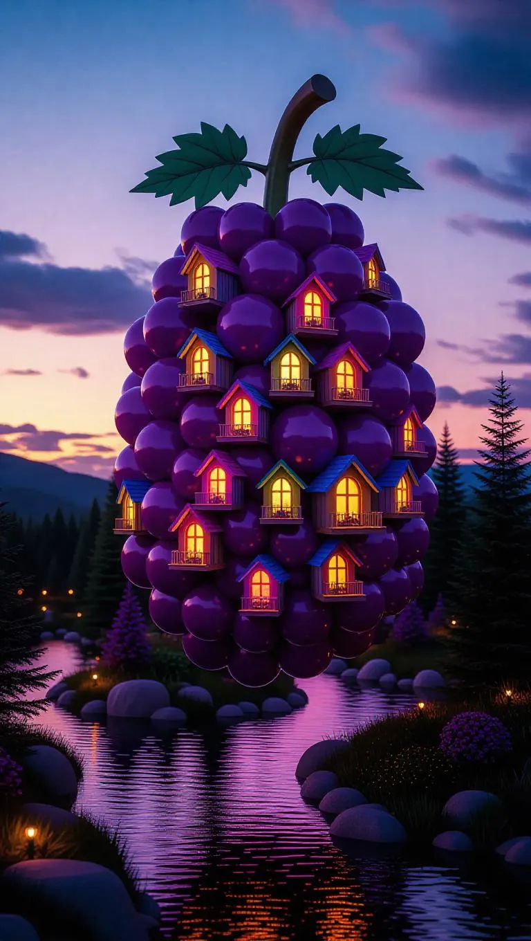 A whimsical floating library shaped like a giant grape, adorned with tiny rainbow-shaped houses and rivers flowing with vibrant juice, suspended over a twilight sky, with fluffy.