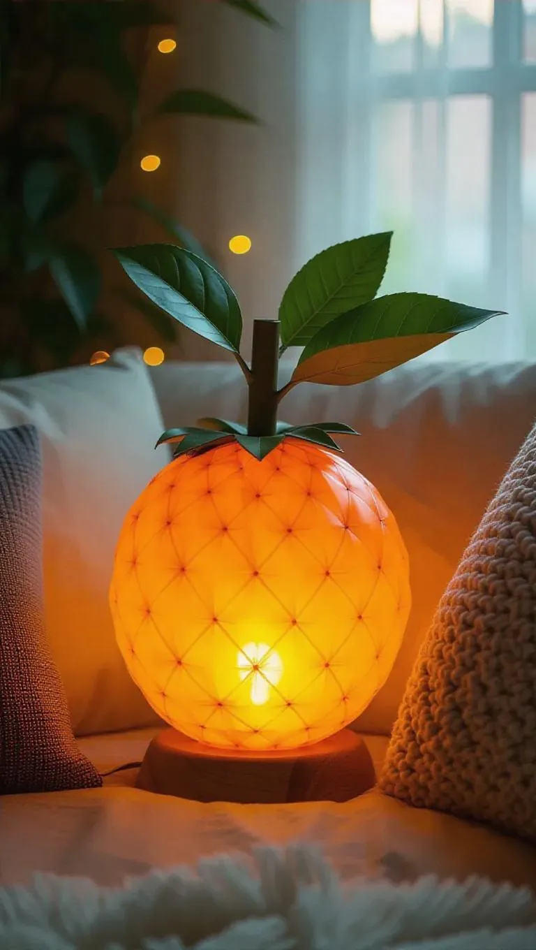 A whimsical lamp shaped like a glowing lychee, casting a warm, flickering light in a cozy corner, surrounded by plush cushions and soft textiles, creating a serene and inviting atmosphere.
