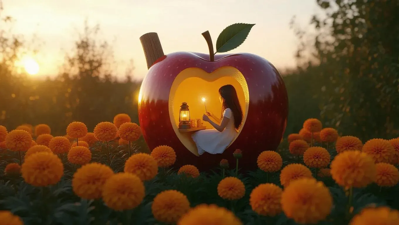 A cozy cabin crafted from a halved apple, nestled among vibrant marigold bushes. Inside, a girl plays with a magic wand, the warm glow of a small lantern casting a gentle light, creating a serene and enchanting atmosphere.