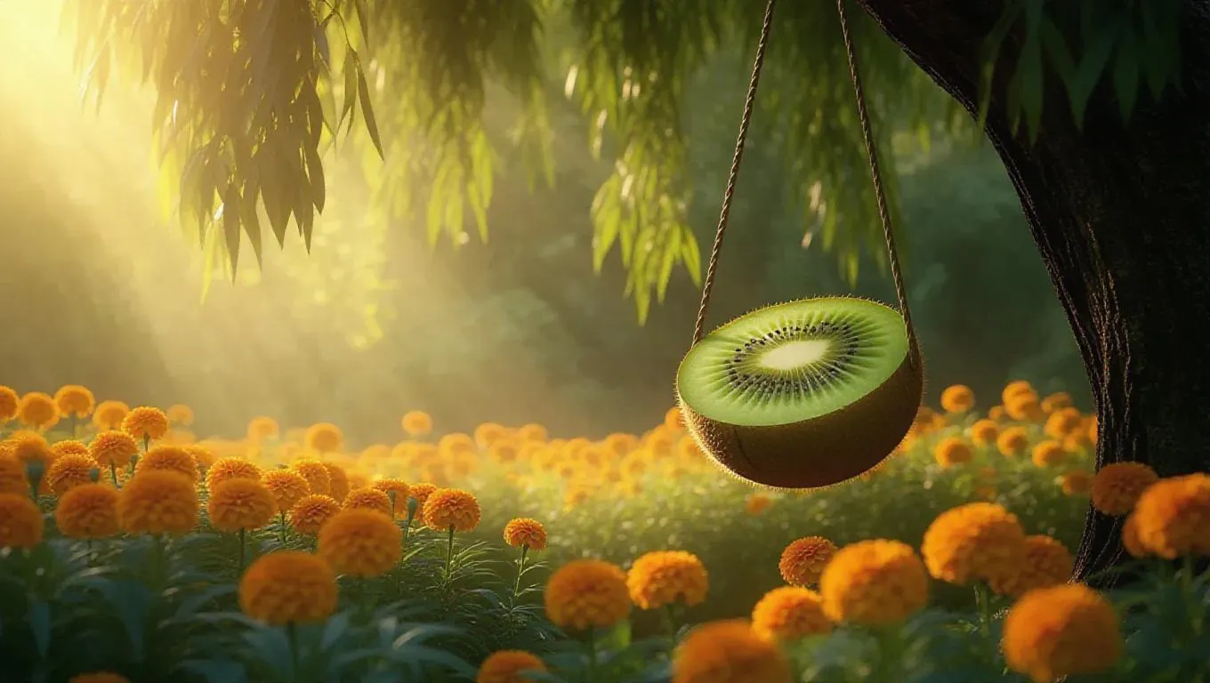 A whimsical half-kiwi-shaped swing hanging from an ancient willow tree, surrounded by a vibrant meadow of marigolds in full bloom, creating a magical and serene atmosphere, with warm sunlight filtering through the leaves, casting dappled shadows.