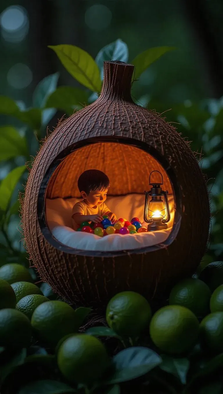 A cozy cabin crafted from a halved coconut, nestled among vibrant lime bushes. Inside, a boy plays with colorful toys, the warm glow of a lantern brightening a cozy nook, creating a serene and enchanting atmosphere