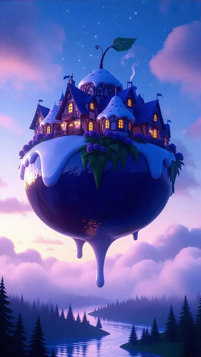 A magical floating island shaped like a giant blueberry, adorned with tiny cake-shaped houses and rivers flowing with creamy milkshake, suspended under a serene twilight sky, with wispy clouds and a gentle breeze