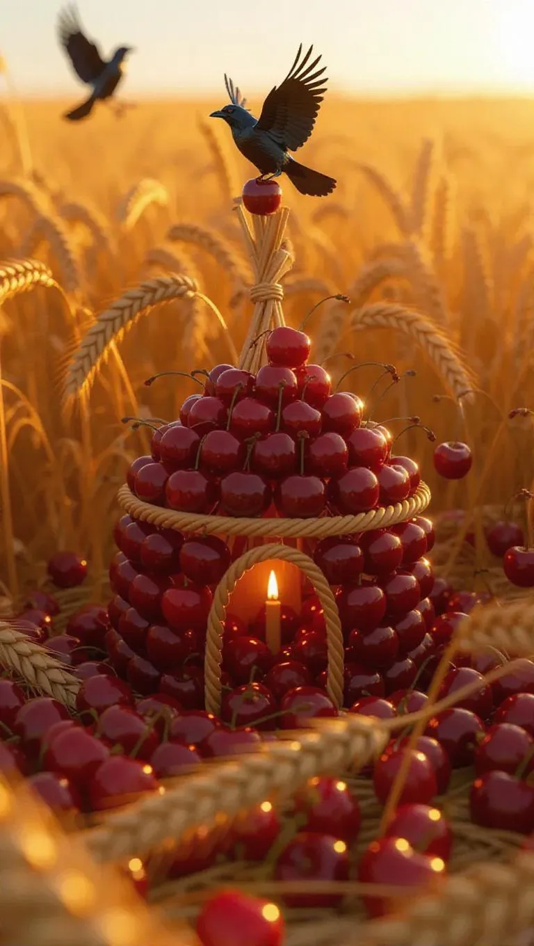 A whimsical little yurt crafted from sweet cherries and creamy butterscotch, nestled in the heart of a golden wheat field, surrounded by a sea of ripe grains and rustling crows, exuding a sweet, enchanting aroma under the warm afternoon sun.