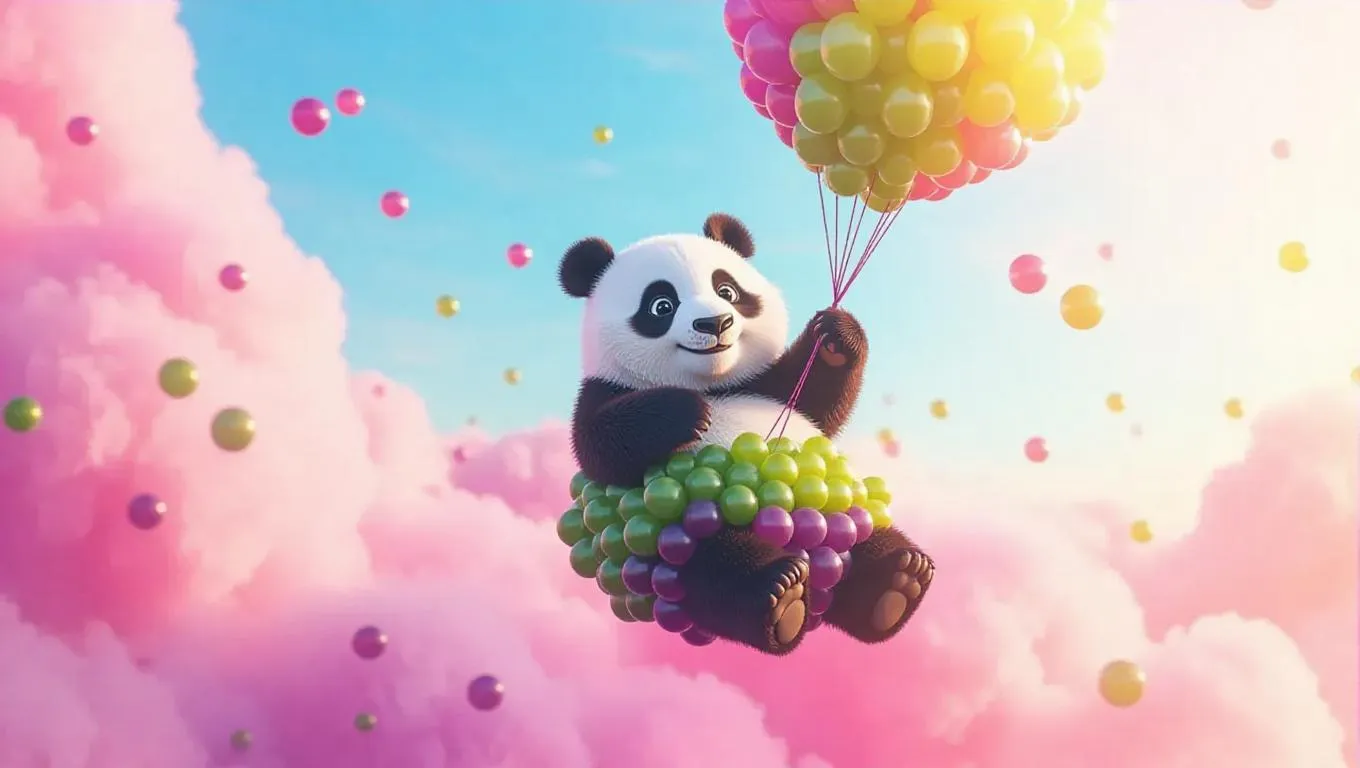 A playful panda piloting a whimsical balloon crafted from tangled grapes, soaring through vibrant candy clouds, with a trail of grape juice glistening in the sunlight, creating a magical and surreal atmosphere.