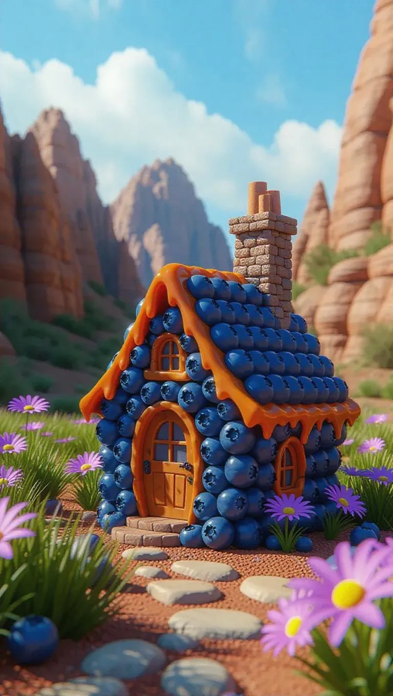 A whimsical little cottage crafted from plump blueberries and sweet caramel, nestled in the heart of a vibrant canyon, surrounded by a sea of rugged rocks and delicate desert flowers, exuding a sweet, enchanting aroma.