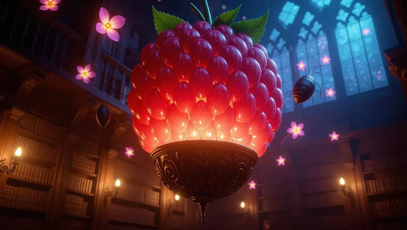 A mystical balloon nestled within a colossal raspberry core, illuminated by glowing flower scrolls that emit a soft, ethereal light. Flying bookworms sip nectar from the scrolls, creating a whimsical and enchanting atmosphere. The walls are lined with ancient scrolls and intricate carvings, enhancing the magical ambiance.