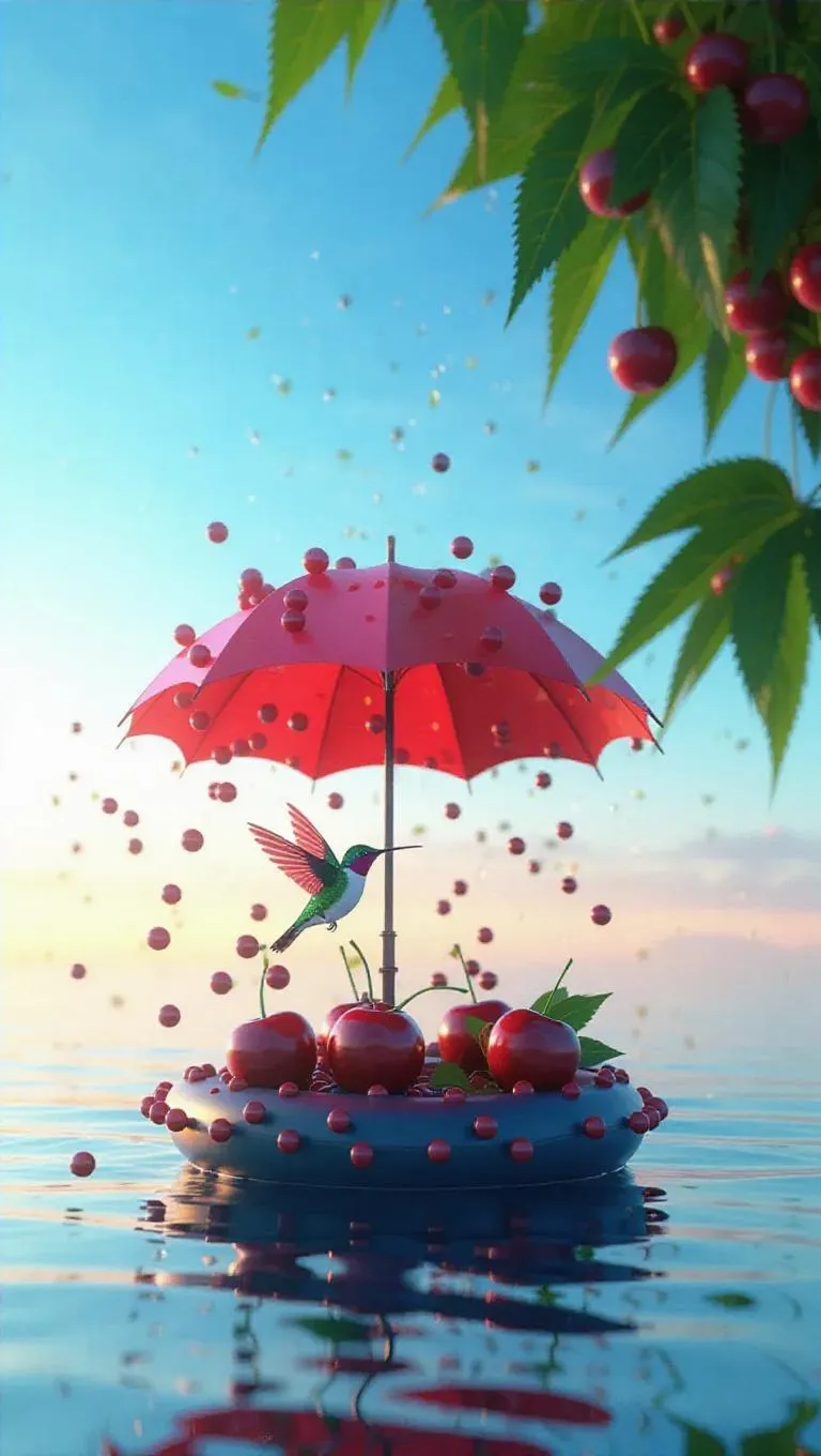 A hummingbird plays under a cheerful cherry umbrella on a whimsical floating dragonfruit raft, surrounded by tranquil, navy blue waters, with rich vine foliage and a warm dusk setting a golden stage.