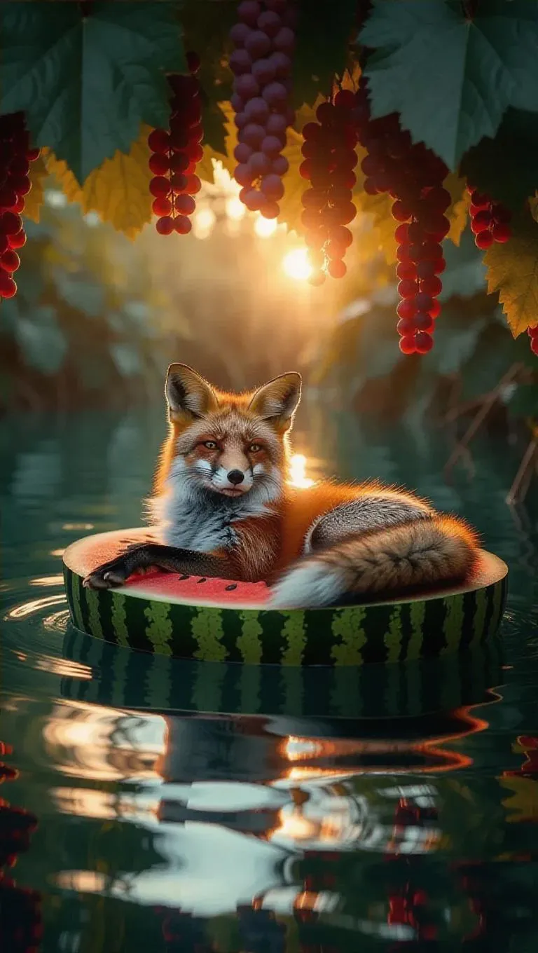 A fox lounges comfortably under a lush grapevine umbrella on a whimsical floating watermelon raft, surrounded by serene, crystal-clear waters, with vibrant tropical foliage and a gentle sunset casting a warm, golden glow