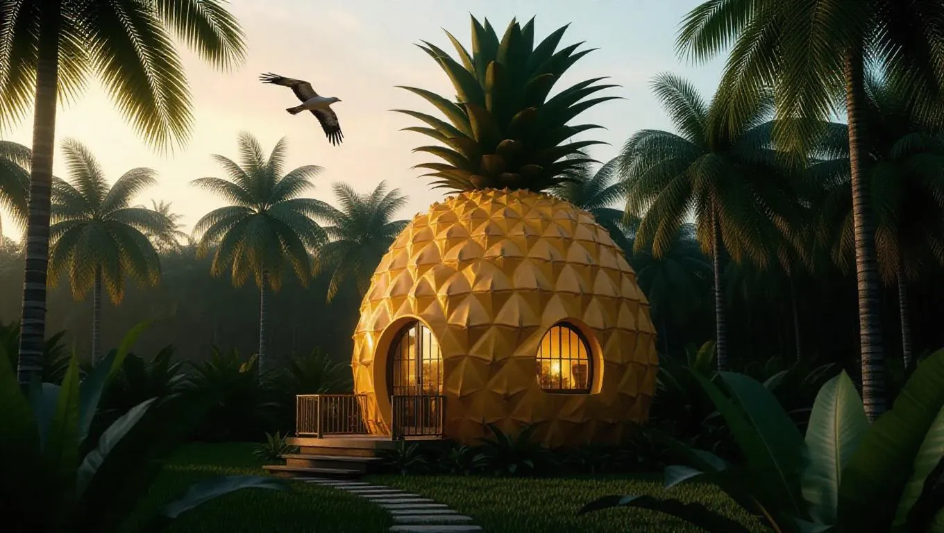 A pineapple-shaped house nestled in a forest, its golden yellow exterior and spiky green crown blending with the lush surroundings, windows glowing warmly as hawks glide through the trees, creating a surreal and enchanting scene.