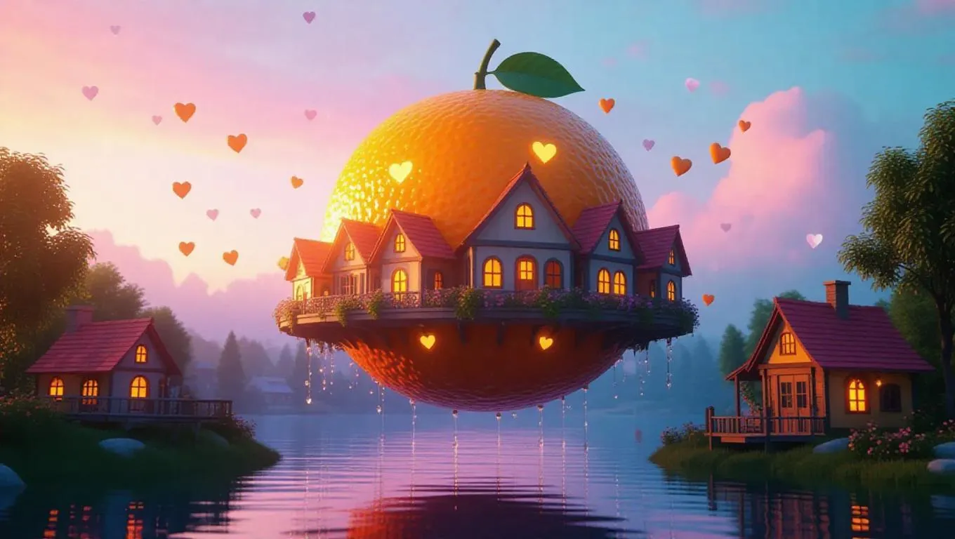 A whimsical floating library shaped like a giant orange, adorned with tiny heart-shaped houses and rivers flowing with vibrant juice, suspended under a dreamy pastel sky, with fluffy.