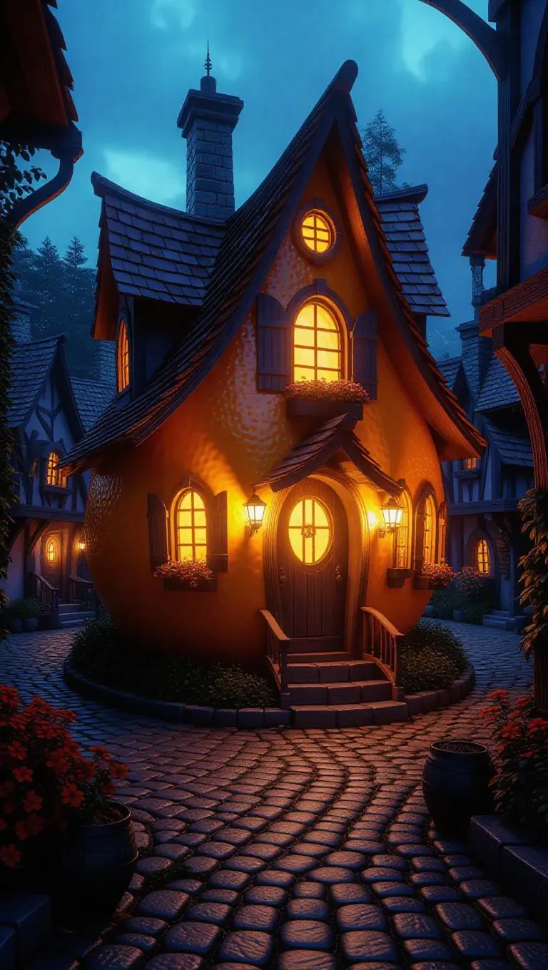 A whimsical house intricately carved from a giant orange, windows glowing warmly at night, surrounded by a fairy tale village, with cobblestone streets and laughter echoing adding to the magical ambiance
