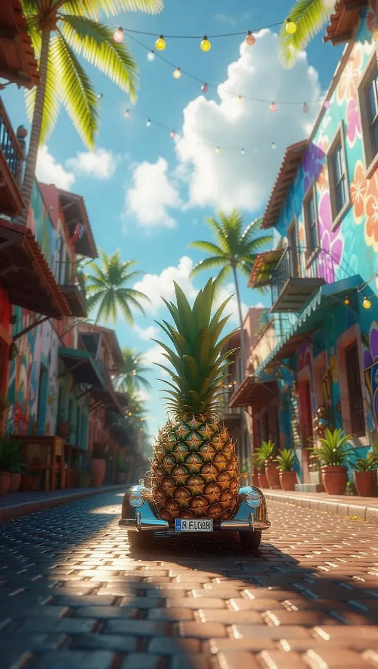 A unique pineapple-shaped automobile navigating through a dynamic street surrounded by eclectic street art and brilliant murals, unveiling a trail of tropical sparkle, with sunlight dancing through fluffy clouds in the azure sky and smiling artists enjoying their work.