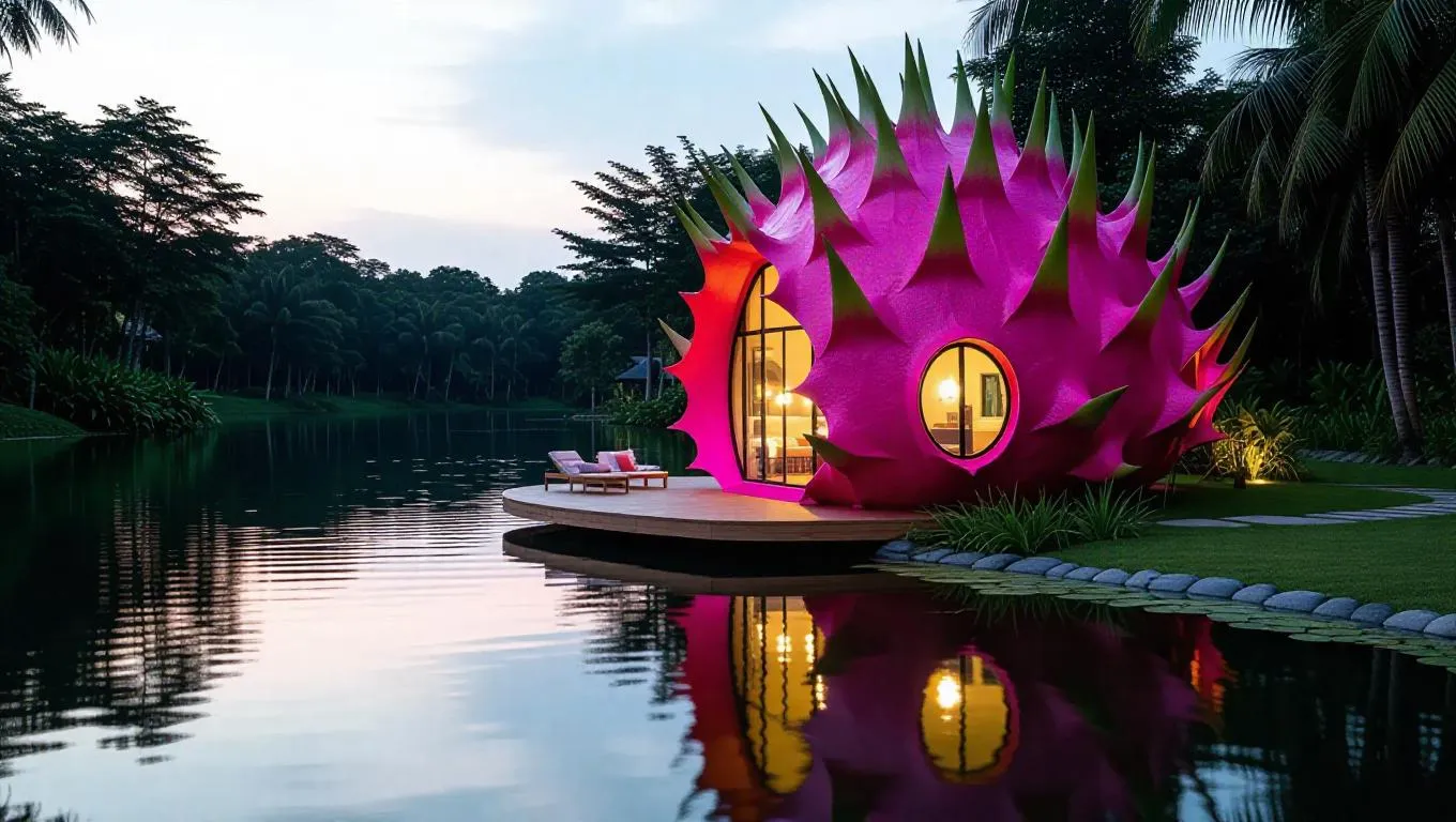 A dragonfruit-shaped villa located by a tranquil lake, its vibrant pink exterior and green spikes contrasting against calm waters, windows glowing warmly as leaves rustle in the breeze, creating a peaceful and enchanting scene.