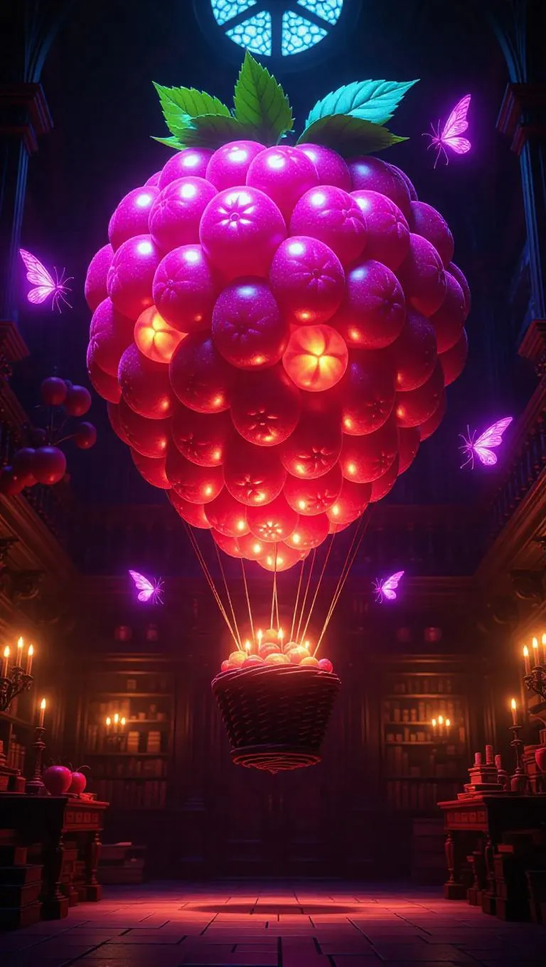 A mystical balloon nestled within a colossal raspberry core, illuminated by glowing fruit scrolls that emit a soft, celestial light. Flying sprites sip nectar from the scrolls, creating a whimsical and enchanting atmosphere. The walls are lined with ancient manuscripts and intricate carvings, enhancing the magical ambiance.