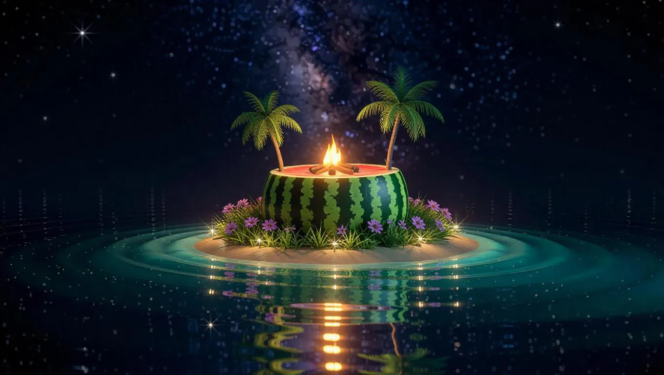A whimsical watermelon island floating in a cosmic sea of twinkling stars, topped with a cozy campfire casting a warm, inviting glow, surrounded by a gentle aura of stardust and celestial light