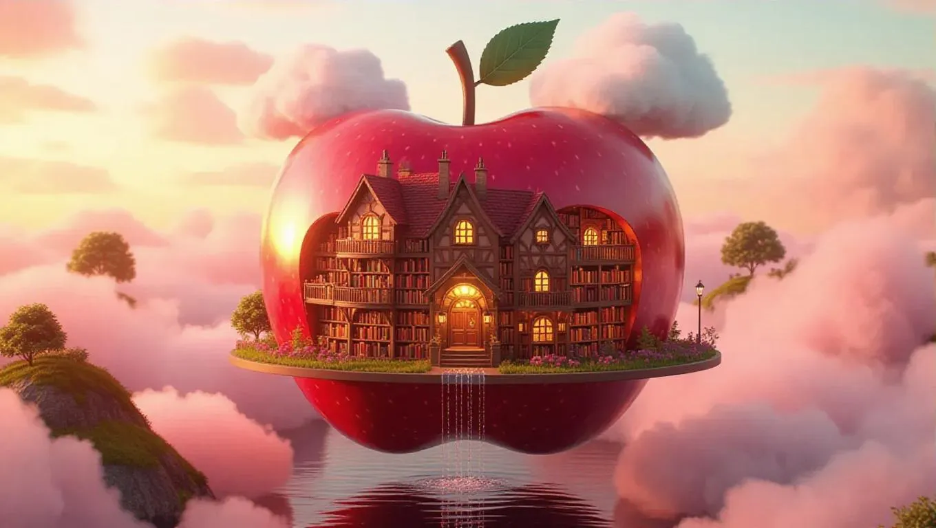 A whimsical floating library shaped like a giant apple, adorned with tiny cloud-shaped houses and rivers flowing with vibrant juice, suspended under a dreamy pastel sky, with fluffy.