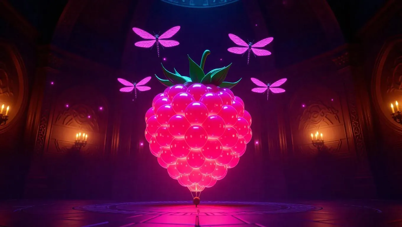 A mystical balloon perched atop a colossal raspberry core, illuminated by glowing fruit scrolls that emit a magical, soothing light. Flying dragonflies sip nectar from the scrolls, creating a whimsical and enchanting atmosphere. The walls are decorated with ancient runes and intricate carvings, enhancing the magical ambiance.