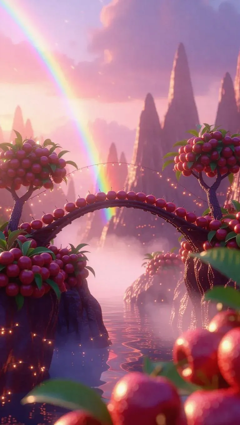 A whimsical bridge intricately woven from twinkling apple peels, connecting two floating fruit islands adorned with exotic lychees. The islands hover above a misty, enchanted desert oasis, with a rainbow arching overhead and glowing fireflies dancing around the bridge.