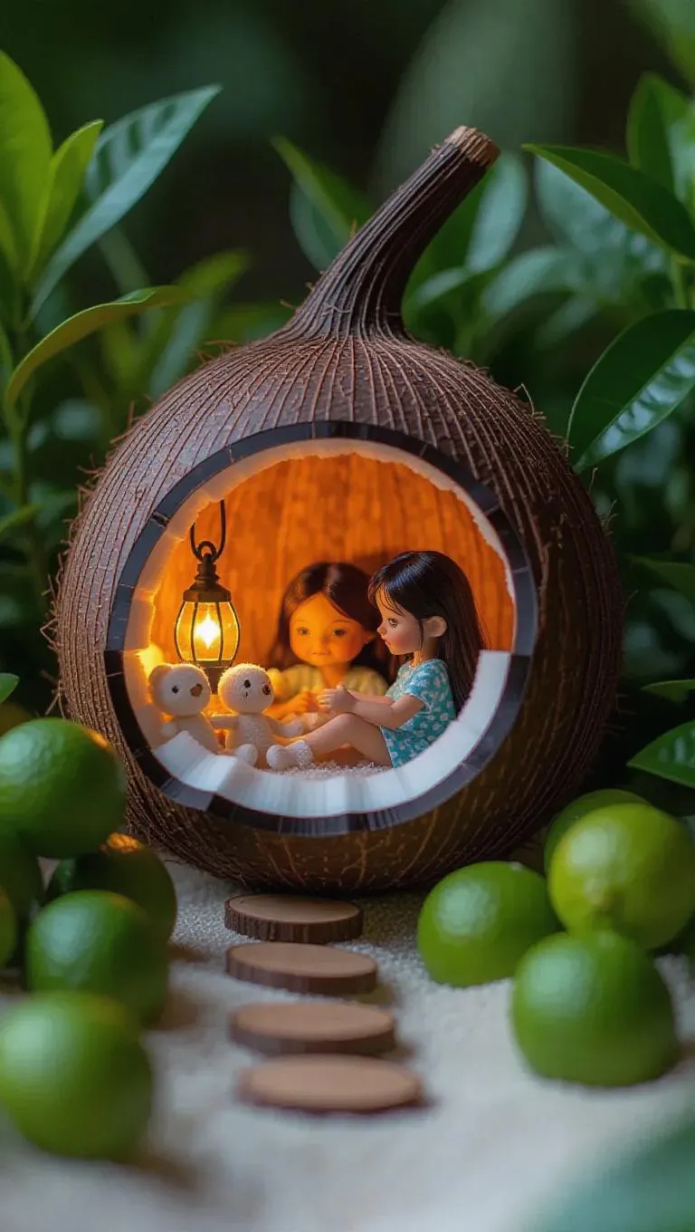 A whimsical hut made from a coconut shell, nestled among vibrant lime bushes. Inside, a girl plays with plush toys, the warm glow of a small lantern casting a gentle light, creating a serene and enchanting atmosphere