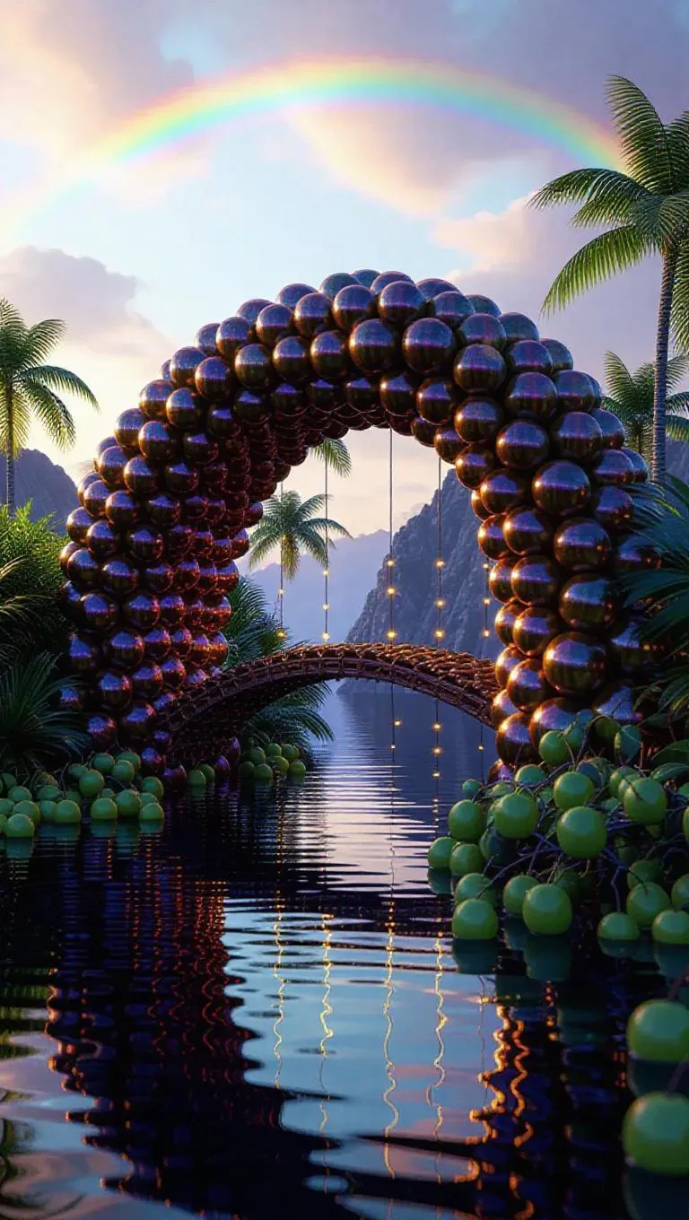 A whimsical bridge intricately woven from iridescent coconut shells, connecting two floating fruit islands adorned with luscious figs. The islands hover above a misty, enchanted desert oasis, with a rainbow arching overhead and glowing fireflies dancing around the bridge.