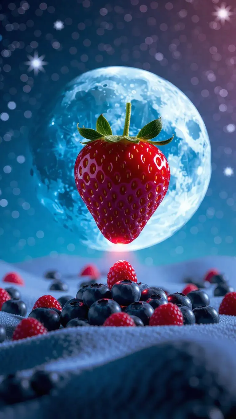 A whimsical strawberry-shaped spaceship gently landing on a velvety, blueberry moon, surrounded by a sprinkle of silvery stars, with a soft, mint sky creating a dreamy, refreshing atmosphere.