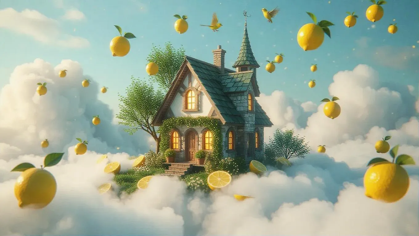 A tranquil cottage nestled in ethereal clouds, encircled by floating fruit rings and lemon birds dancing with gentle lullabies, creating a whimsical and serene atmosphere