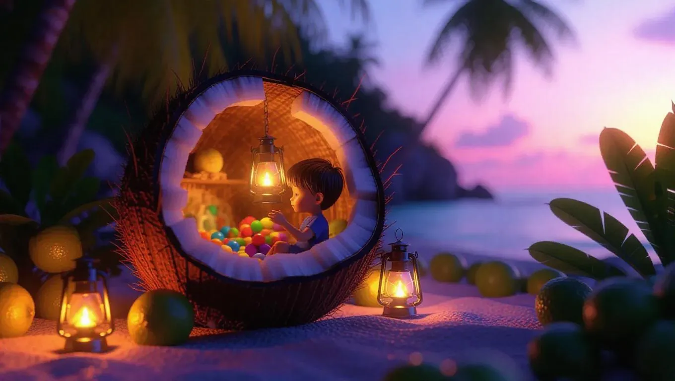 A cozy cabin constructed from a halved coconut, nestled among colorful lime bushes. Inside, a boy plays with colorful toys, the flickering glow of a camp lantern casting a soft light, creating a serene and enchanting atmosphere