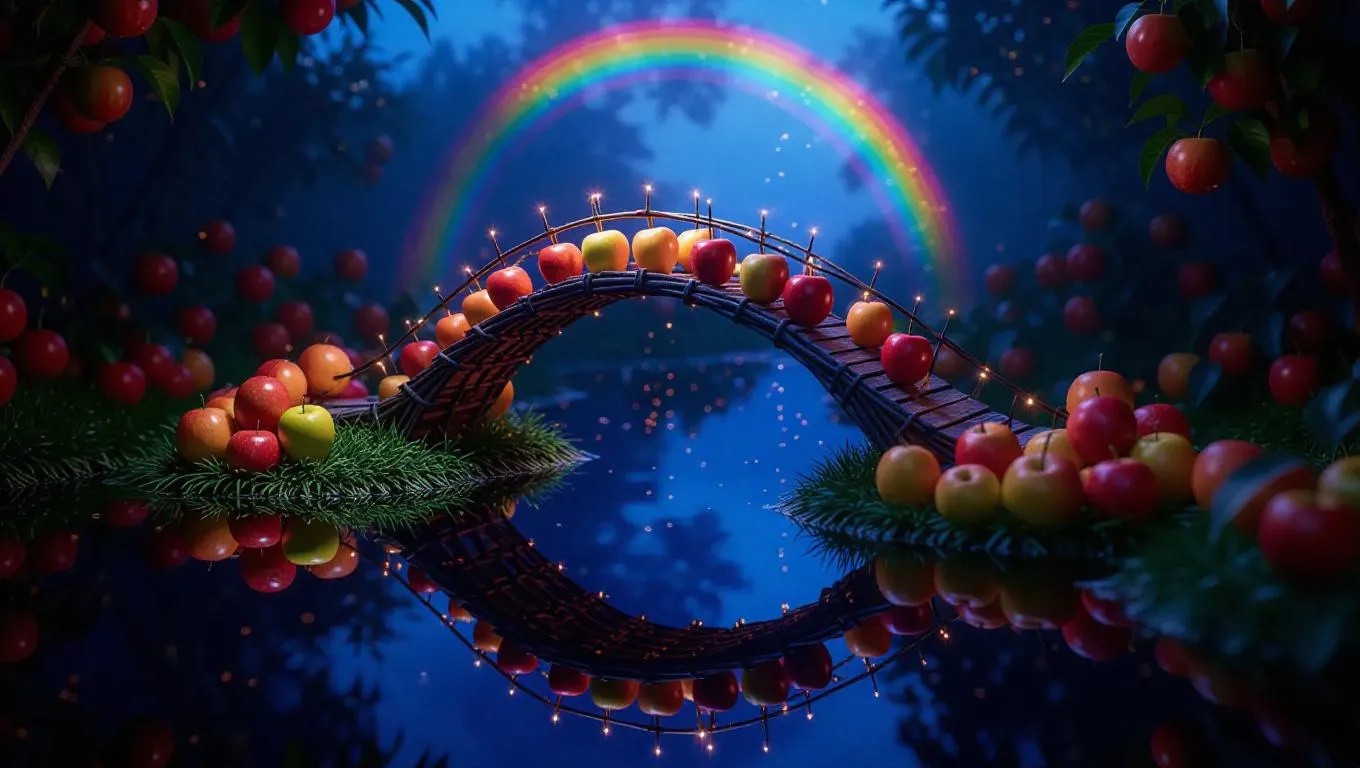 A whimsical bridge intricately woven from shimmering apple skins, connecting two floating fruit islands adorned with ripe, juicy fruits. The islands hover above a sparkling, enchanted sea, with a rainbow arching overhead and glowing fireflies dancing around the bridge.