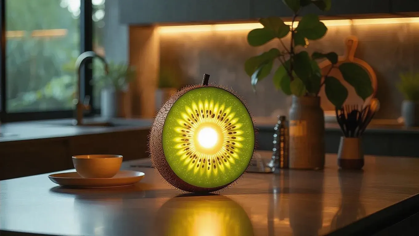 A whimsical lamp shaped like a glowing kiwi, casting a warm, ambient light in a modern kitchen, surrounded by sleek countertops and soft textiles, creating a serene and inviting atmosphere.