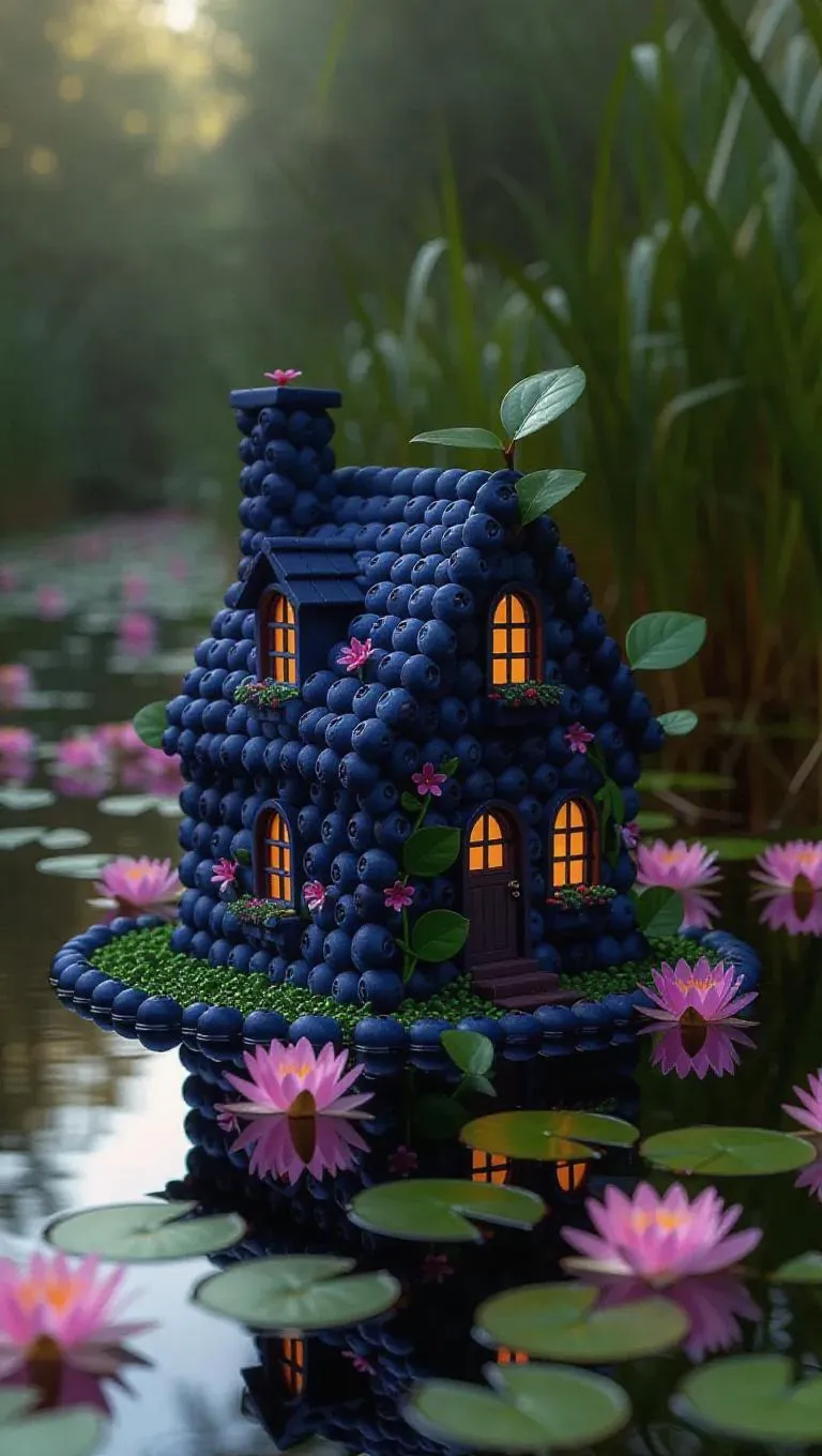 A whimsical little cottage crafted from plump blueberries and silken ganache, nestled in the heart of a sparkling riverside, surrounded by a sea of vibrant green reeds and delicate water lilies, exuding a sweet, enchanting aroma.