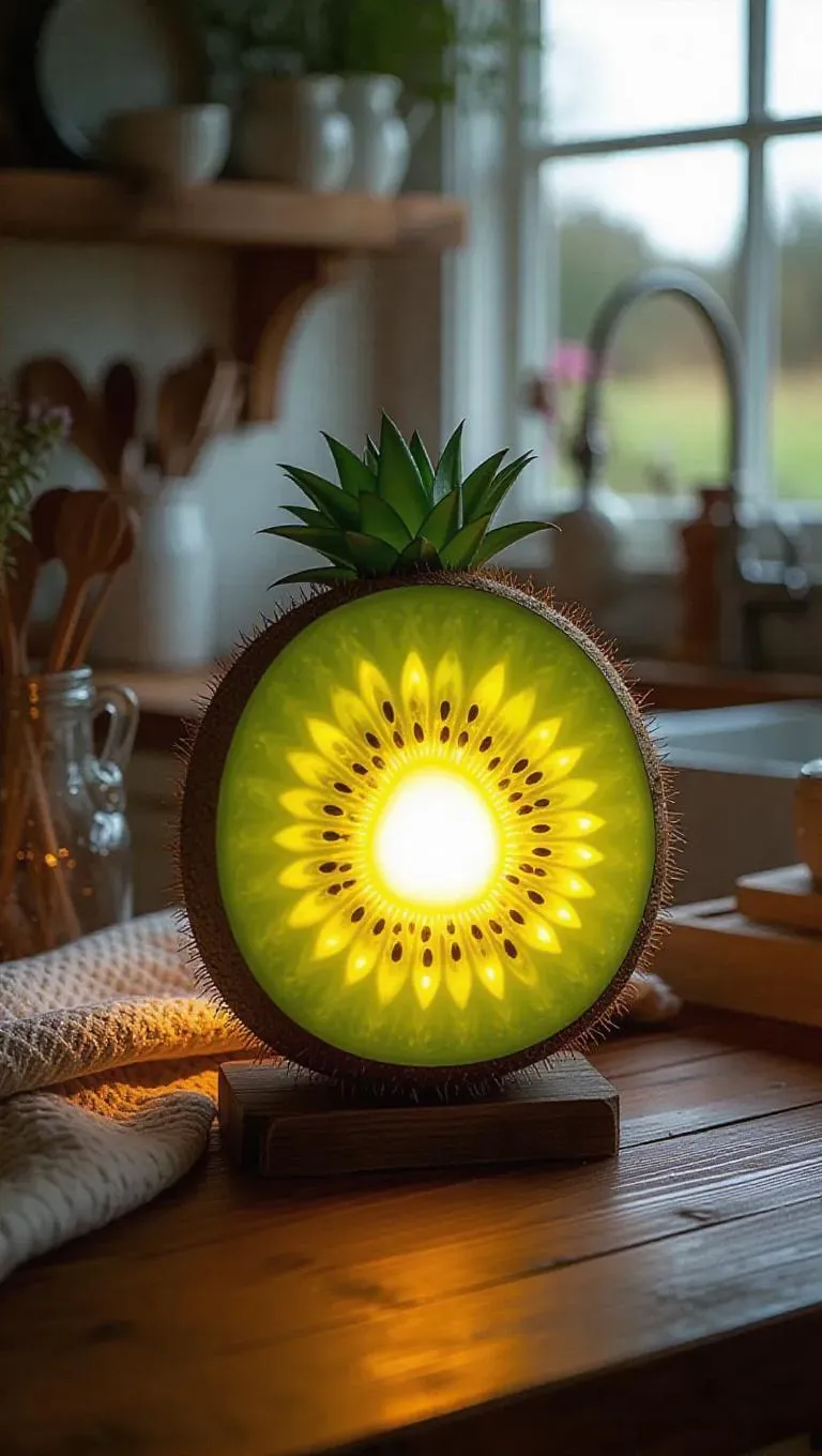 A whimsical lamp shaped like a glowing kiwi, casting a warm, ambient light in a rustic farmhouse kitchen, surrounded by distressed countertops and farmhouse textiles, creating a homey and welcoming atmosphere.