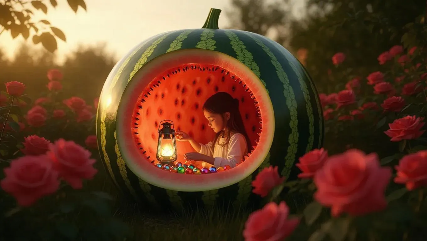 A cozy cabin crafted from a halved watermelon, nestled among vibrant rose bushes. Inside, a girl plays with shiny marbles, the warm glow of a small lantern casting a gentle light, creating a serene and enchanting atmosphere.