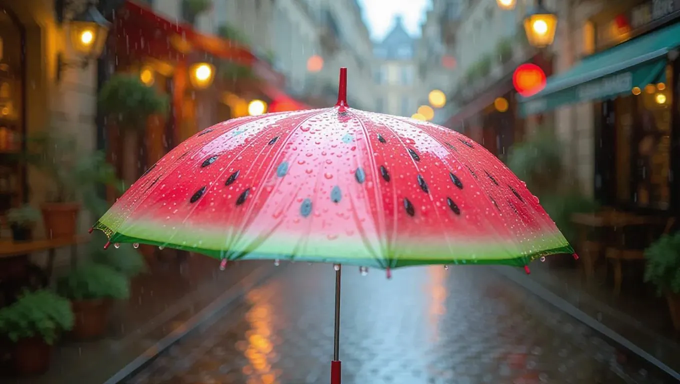A stylish umbrella shaped like a watermelon slice, open under a gentle drizzle, with droplets elegantly falling from its vibrant pink and green surface, set against a vintage, European street backdrop.