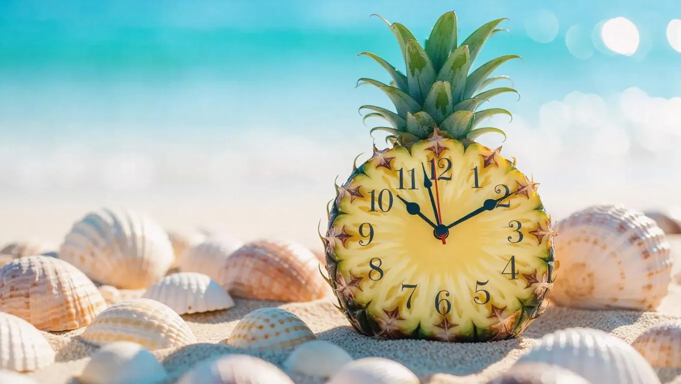 A whimsical clock shaped like a half pineapple, with seed-shaped hour markers, resting on a sunny beach backdrop with seashells, exuding a refreshing and playful summer vibe.
