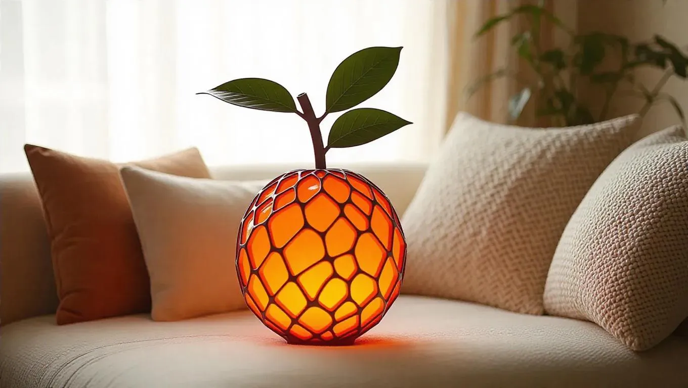 A whimsical lamp shaped like a glowing lychee, casting a warm, ambient light in a cozy nook, surrounded by plush cushions and soft textiles, creating a serene and inviting atmosphere.