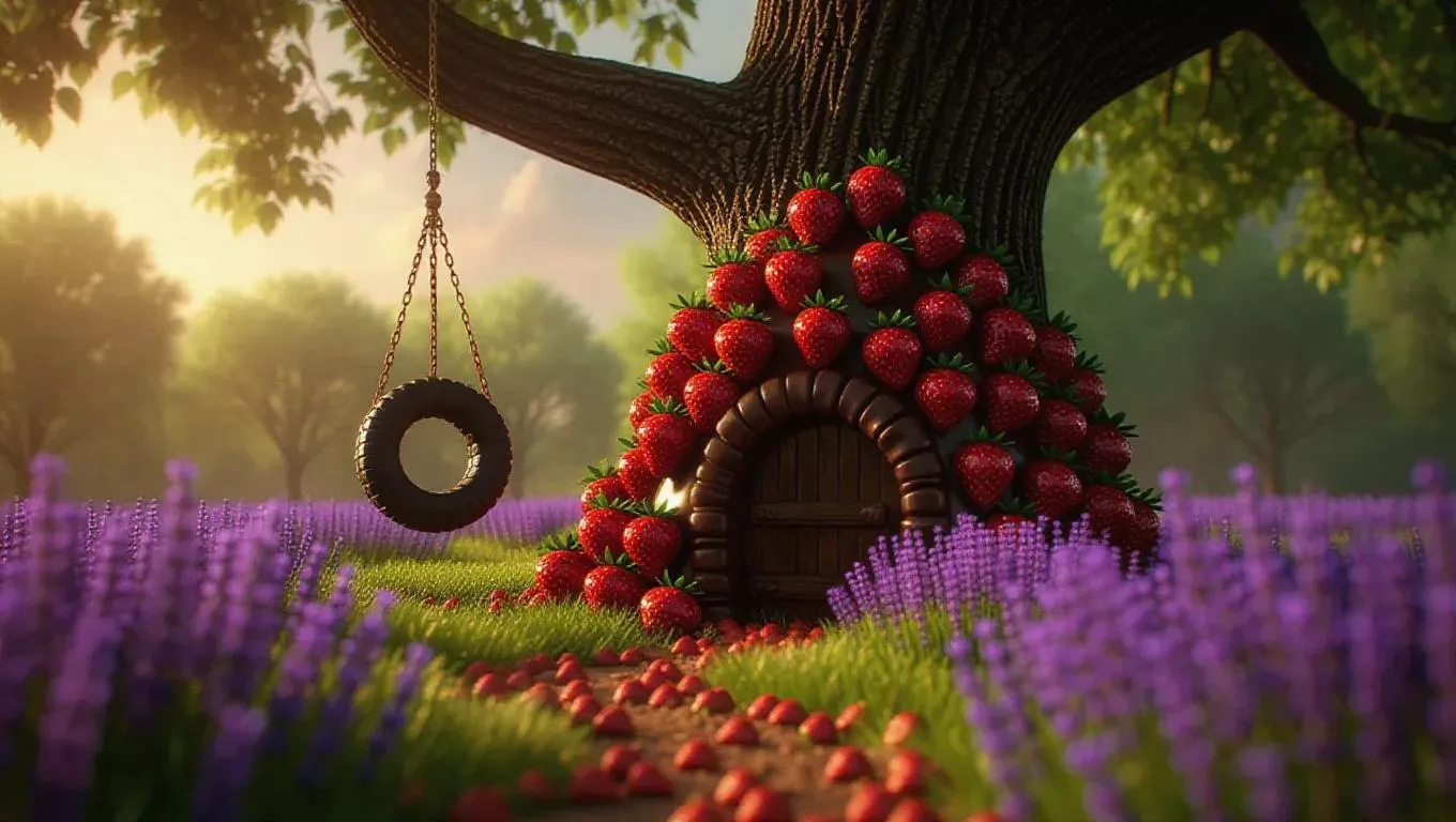A whimsical little fortress crafted from juicy strawberries and rich chocolate frosting, nestled in the heart of a wildflower meadow, surrounded by a sea of colorful wildflowers and fragrant lavender, with a tire swing hanging from a grand maple tree, exuding a sweet, enchanting aroma under the soft spring sunlight.