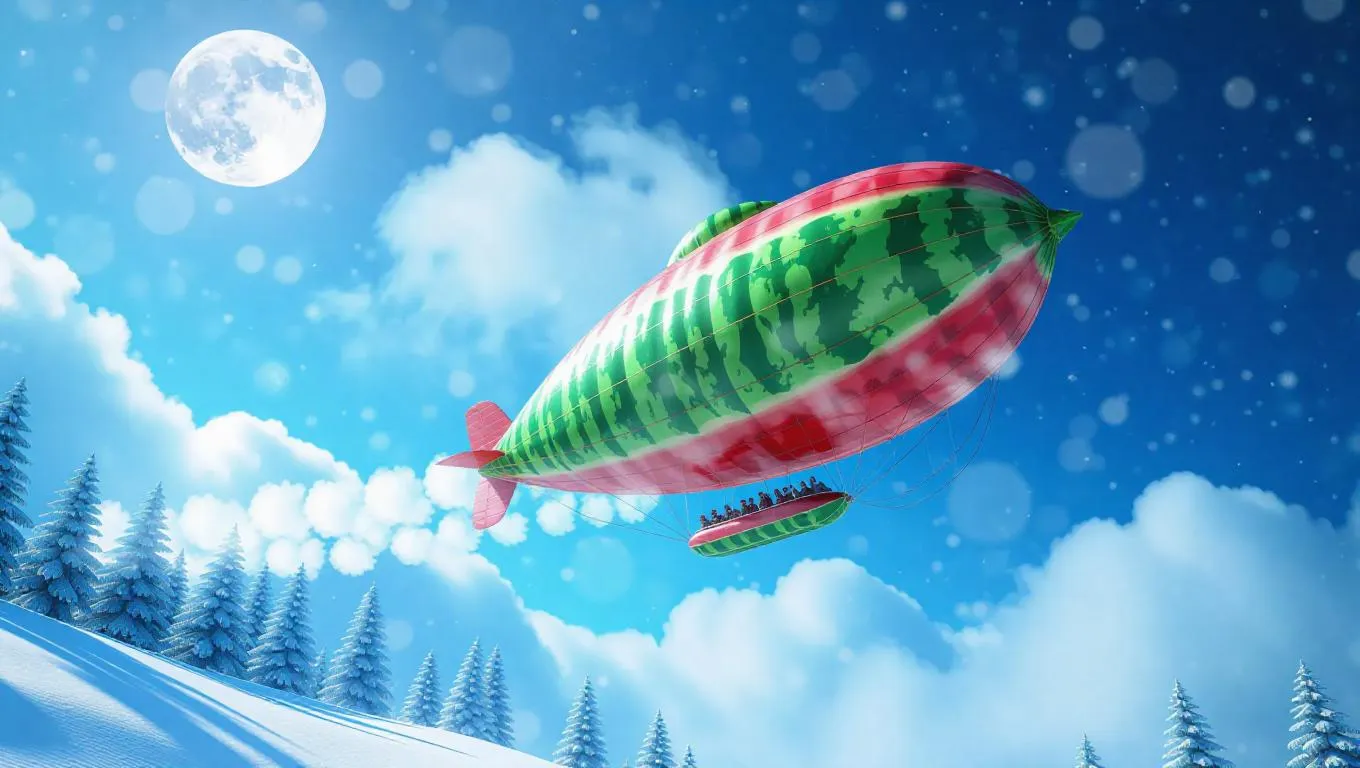 A whimsical watermelon-shaped blimp gracefully gliding through a snowy winter sky, carrying delighted travelers. The blimp's vibrant green and red hues contrast with the soft white snowflakes, creating a surreal and enchanting atmosphere. Moonlight reflects off the snow, casting a cool blue glow that enhances the magical journey