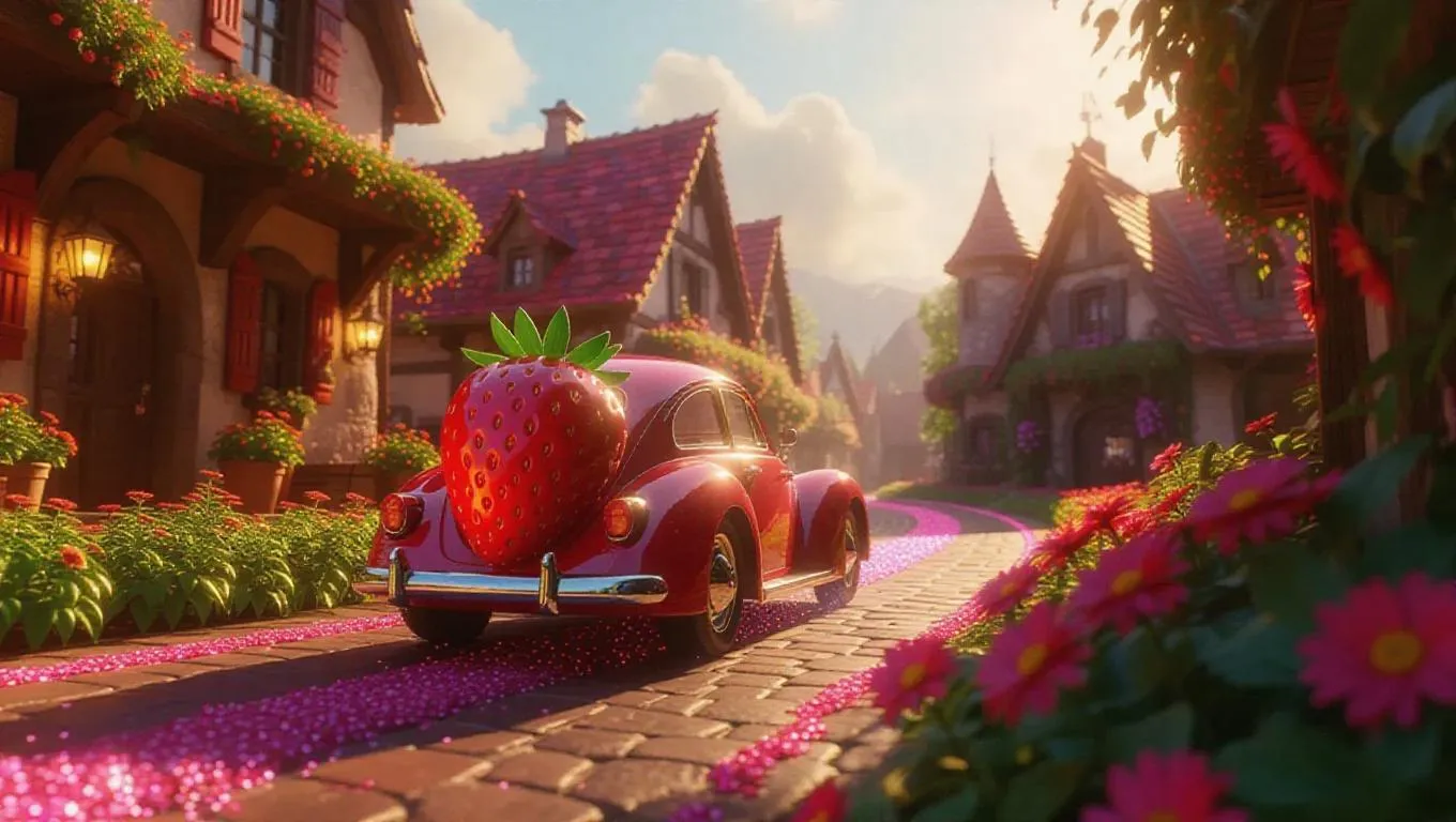 A whimsical strawberry-shaped car cruising through a picturesque town adorned with colorful flower gardens, leaving a magical trail of sparkling berry dust, with sunbeams filtering through bright skies and joyful villagers greeting from flower-themed cottages