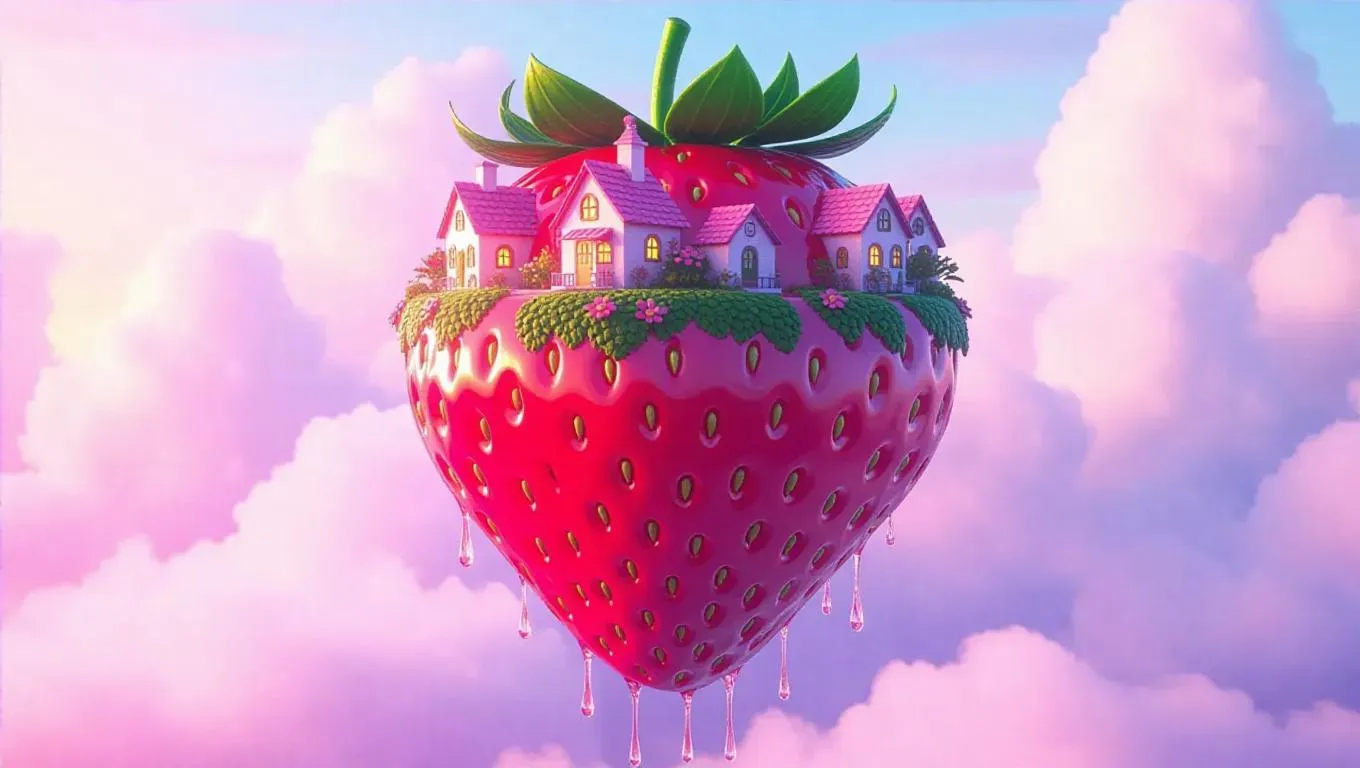 A whimsical floating island shaped like a giant strawberry, adorned with tiny fruit-shaped houses and rivers flowing with vibrant juice, suspended under a dreamy pastel sky, with fluffy clouds and a gentle breeze