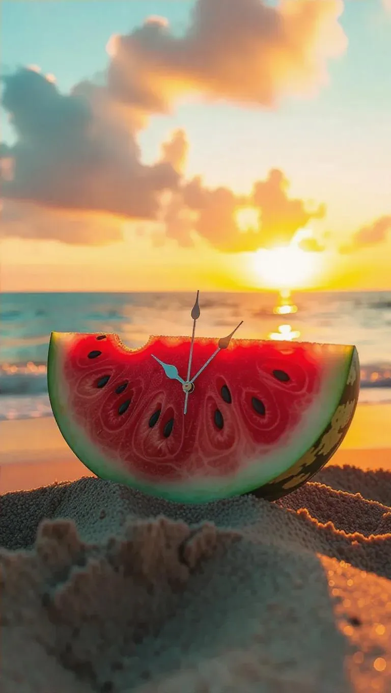 A whimsical clock shaped like a half watermelon, with sun-shaped hour markers, resting on a vibrant sunset beach backdrop, exuding an enchanting and warm summer vibe.