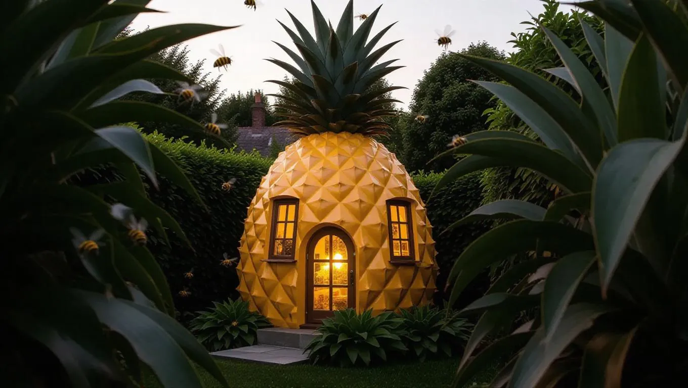 A pineapple-shaped house in a garden, its golden yellow exterior and spiky green crown nestled among green foliage, windows glowing warmly as bees buzz around, creating a surreal and enchanting scene.