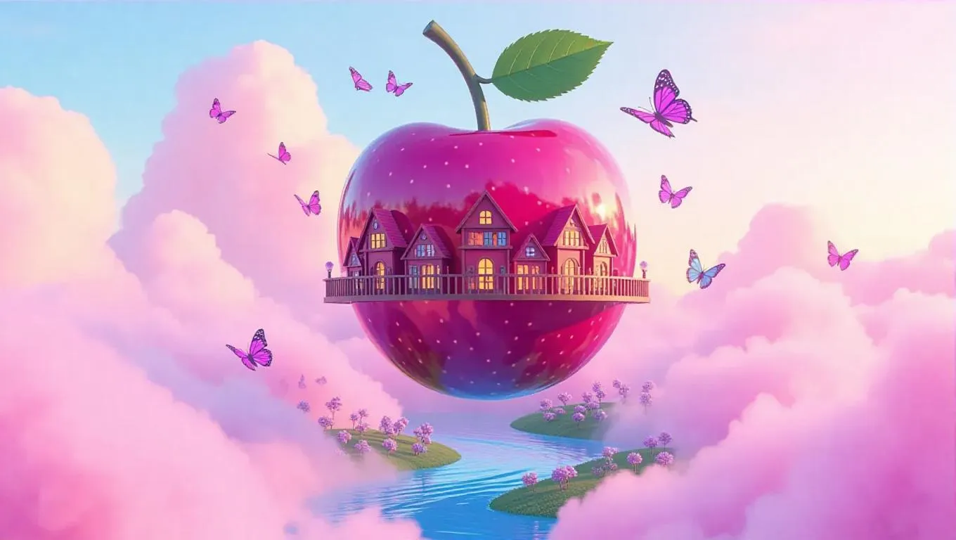 A whimsical floating library shaped like a giant cherry, adorned with tiny butterfly-shaped houses and rivers flowing with vibrant juice, suspended under a dreamy pastel sky, with fluffy.