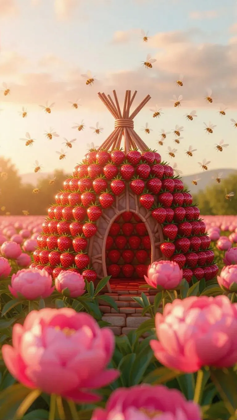 A whimsical little yurt crafted from ripe strawberries and glossy honey glaze, nestled in the heart of a blooming peony field, surrounded by a sea of pink peonies and fluttering bees, exuding a sweet, enchanting aroma under the bright midday sun.