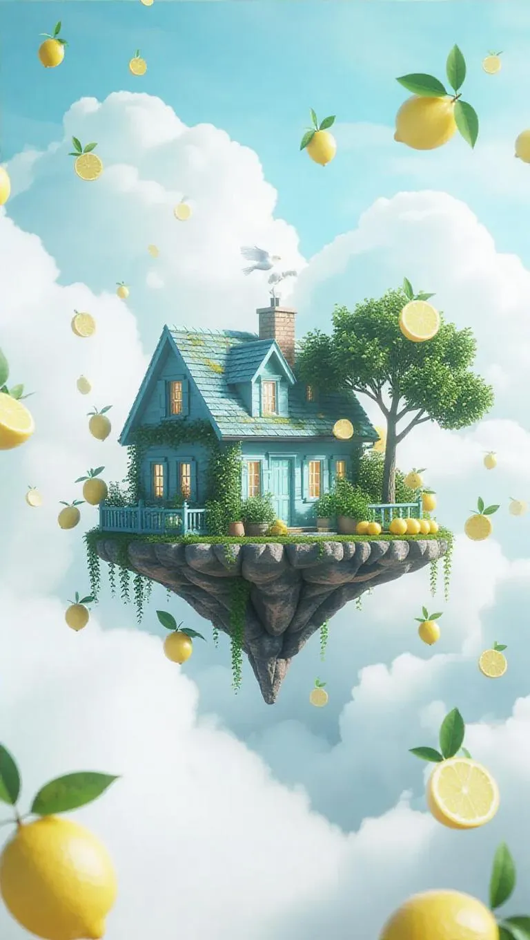 A tranquil cottage nestled in ethereal clouds, encircled by floating fruit rings and lemon birds performing gentle lullabies, creating a whimsical and serene atmosphere