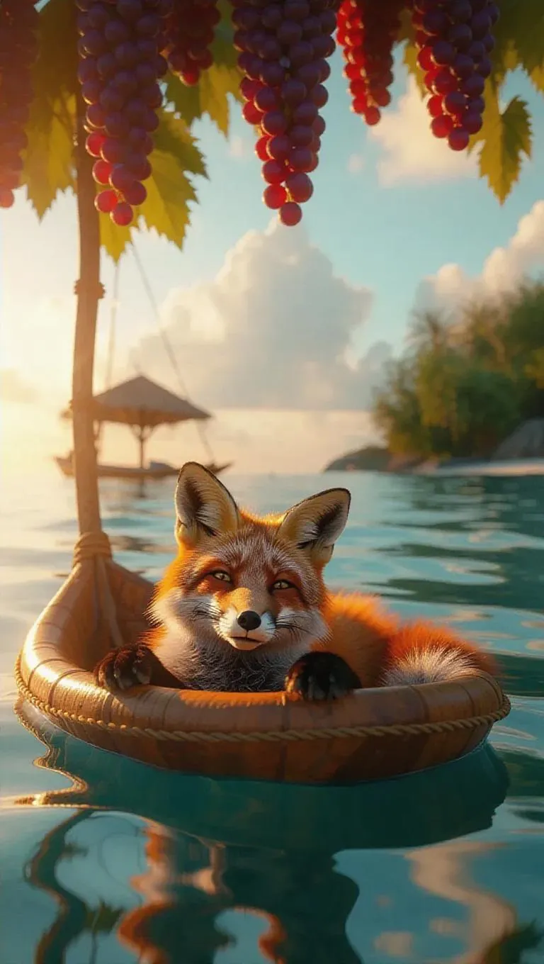 A fox lounges playfully under a lush grapevine umbrella on a whimsical floating papaya raft, surrounded by serene, crystal-clear waters, with bright, sunny skies and a gentle sunset casting a warm, golden glow