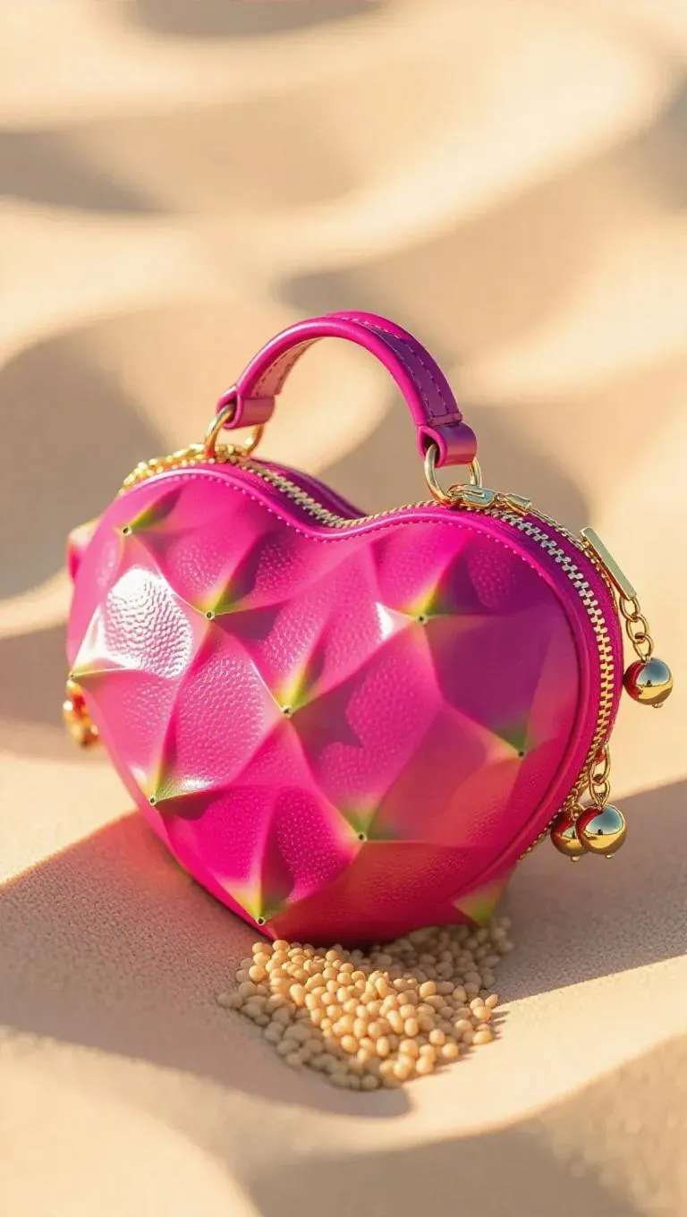 A heart-shaped dragonfruit handbag with golden zippers and a tiny bell charm, exuding a whimsical charm, set against a sandy beige backdrop, with delicate seed patterns and soft, dreamy lighting.