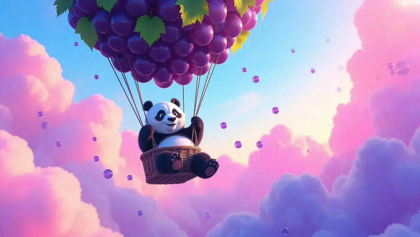 An adventurous panda piloting a whimsical balloon crafted from tangled grapes, soaring through vibrant dreamlike clouds, with a trail of grape juice glistening in the sunlight, creating a magical and surreal atmosphere.