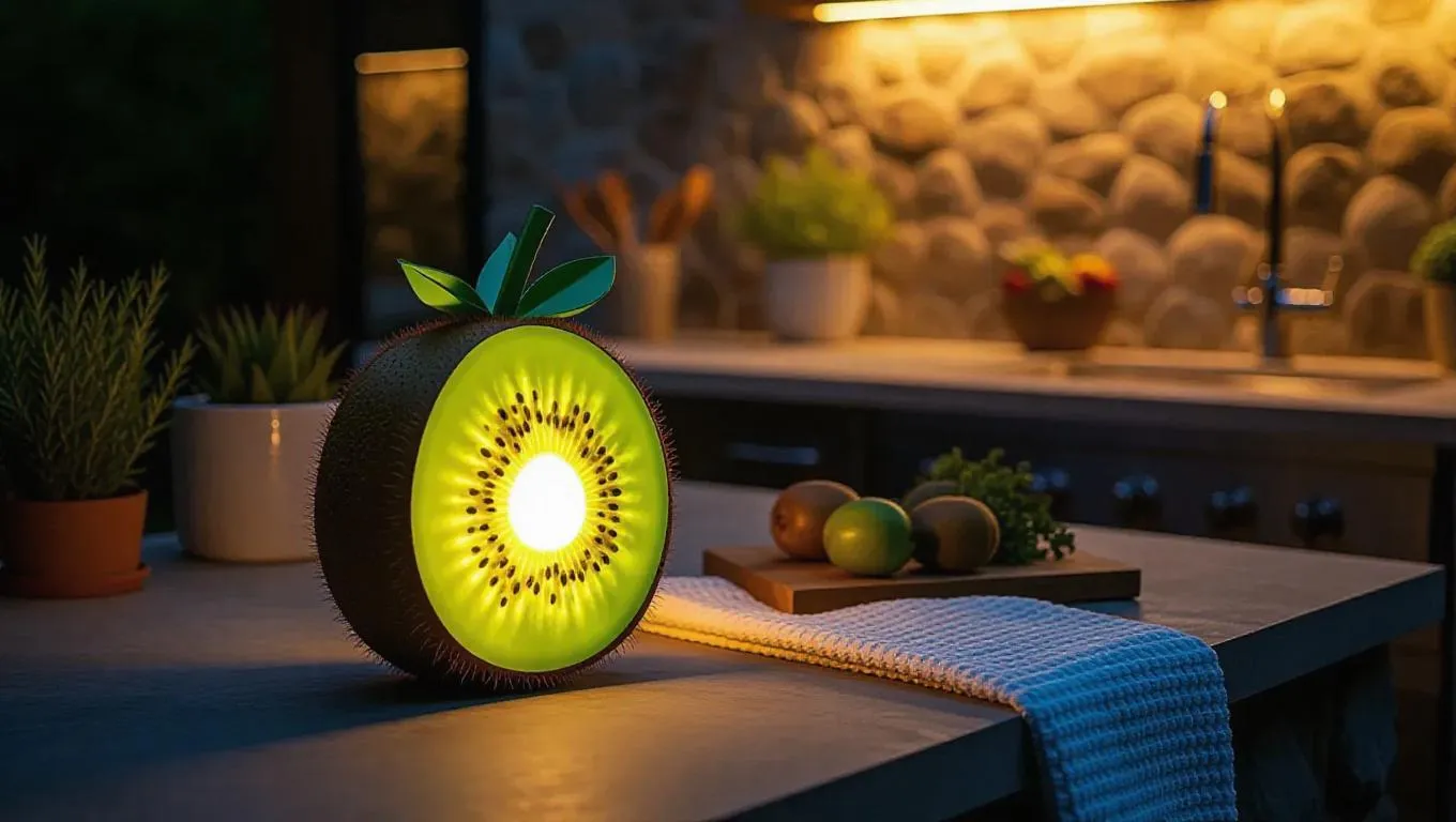 A whimsical lamp shaped like a glowing kiwi, casting a soft, ambient light in an outdoor kitchen, surrounded by stone countertops and outdoor textiles, creating a natural and relaxed atmosphere.