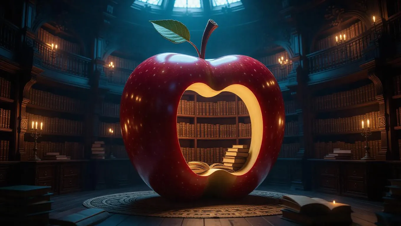 A mystical library nestled within a colossal apple core, illuminated by glowing fruit scrolls that emit a soft, ethereal light. Flying bookworms sip nectar from the scrolls, creating a whimsical and enchanting atmosphere. The walls are lined with ancient tomes and intricate carvings, enhancing the magical ambiance
