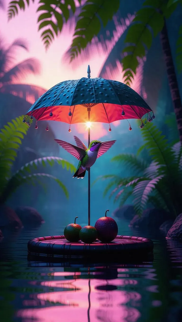 A hummingbird hovers playfully under a delicate passionfruit umbrella on a whimsical floating papaya raft, surrounded by serene, jade-green waters, with lush ferns and a soothing dusk enveloping the scene in a soft lavender light.